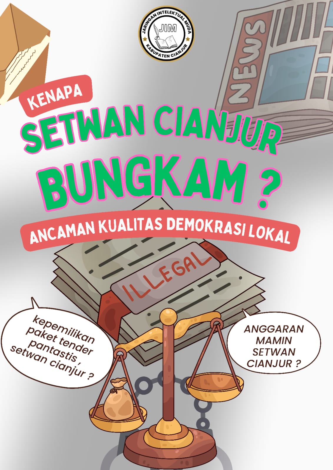 JIM pun mendesak Inspektorat, BPK, dan aparat penegak hukum agar turun tangan memeriksa kejanggalan dalam anggaran dan tender di tubuh Sekretariat DPRD Cianjur.